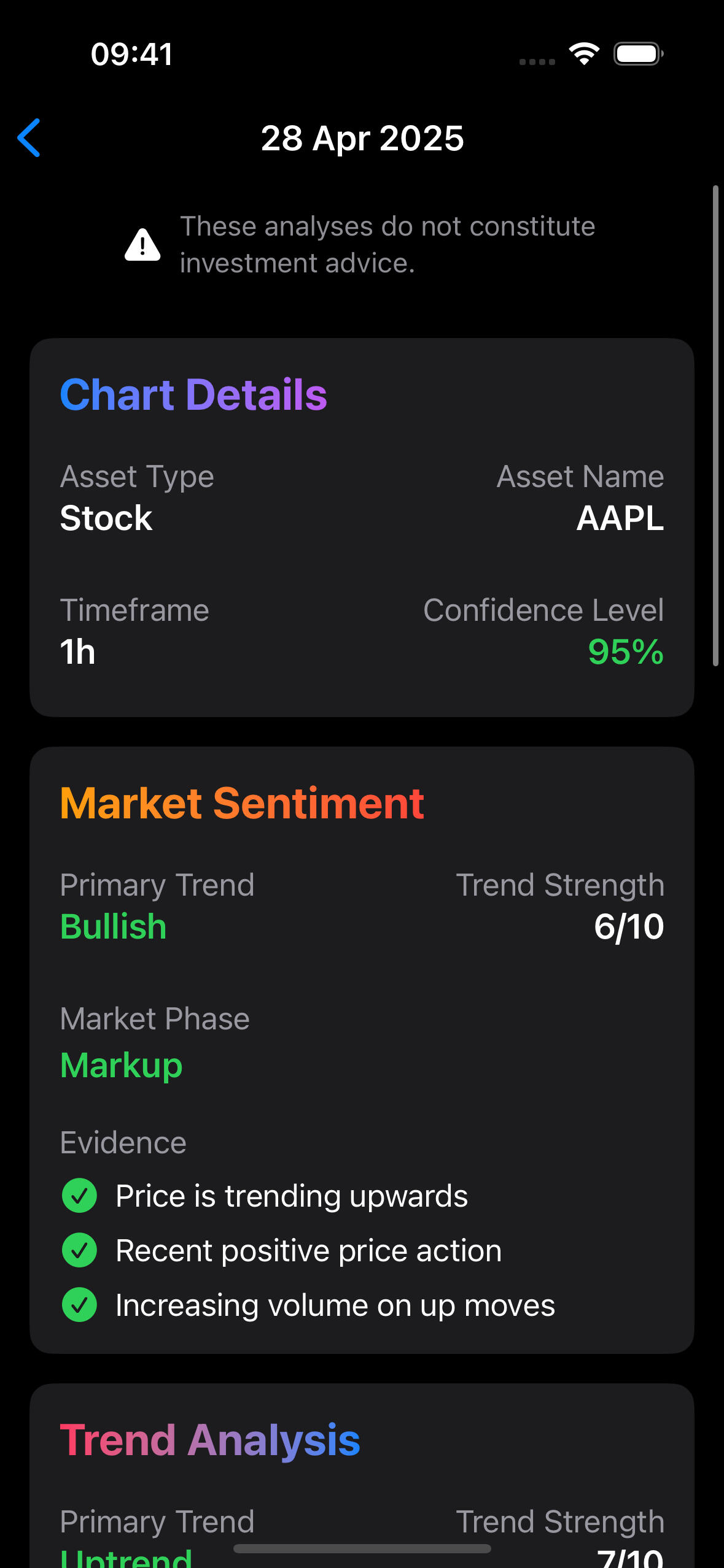 Chart AI stores your analysis history, creating a valuable trading journal that helps you improve your strategy over time. Each analysis includes:Market Sentiment Analysis showing overall trend direction and strength